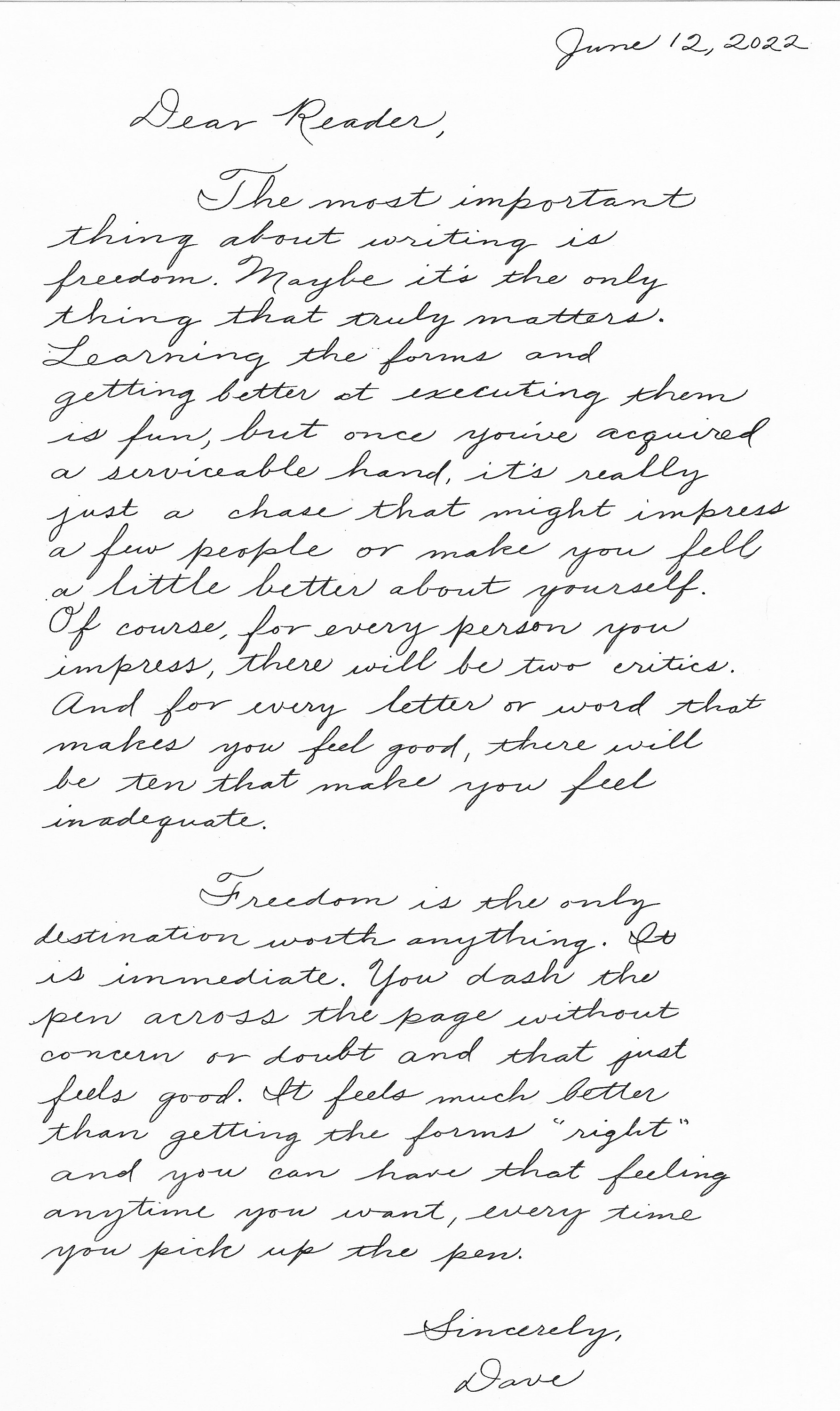 Today, I’m giving myself the freedom to tell you about the Palmer Method. You can find freedom in writing regardless of the approach, but I think the Palmer Method is the most naturally free way to write. With the Palmer Method, you glide the pen across the page without tension, pain, or fatigue.
