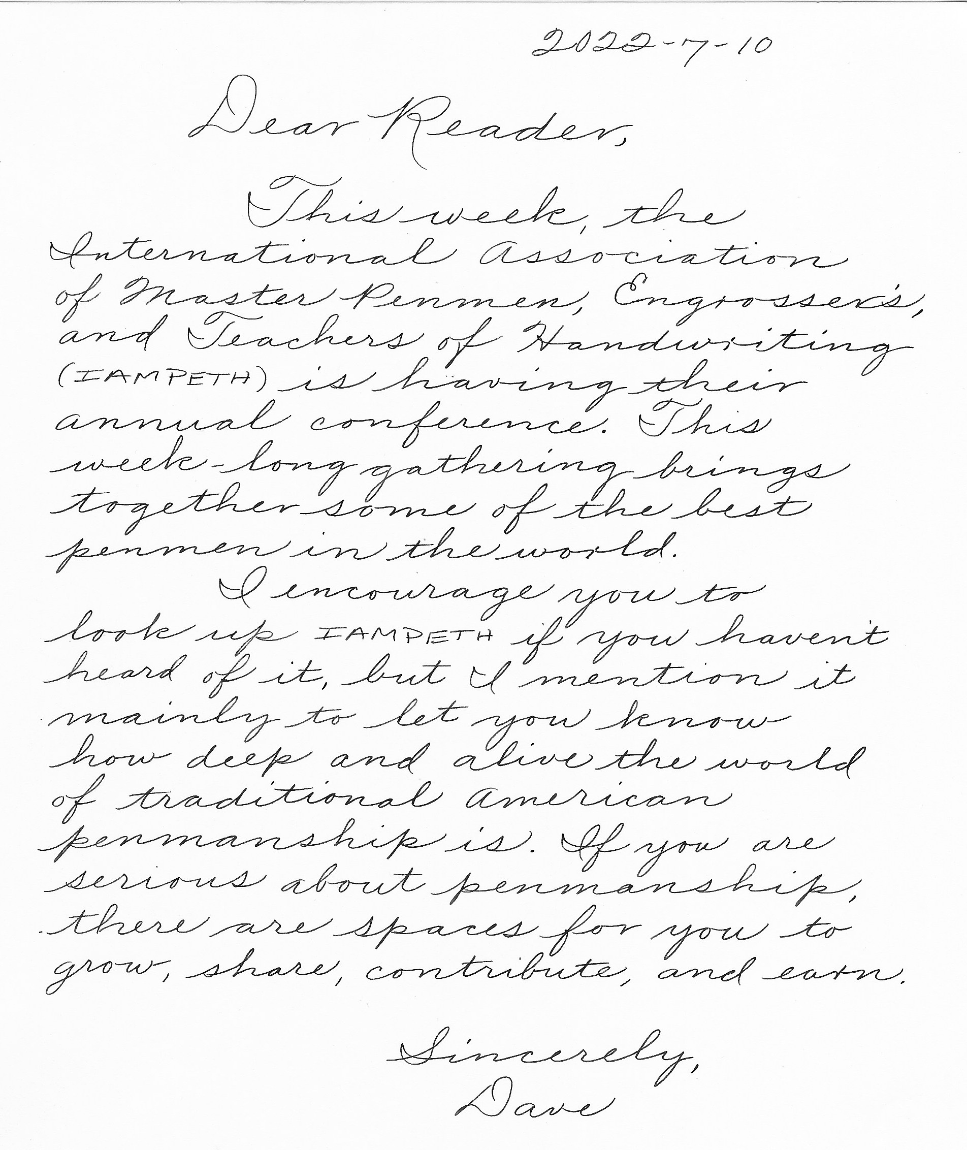 This week, the International Association of Master Penmen, Engrossers, and Teachers of Handwriting (IAMPETH) is having their annual conference. This week-long gathering brings together some of the best penmen in the world.